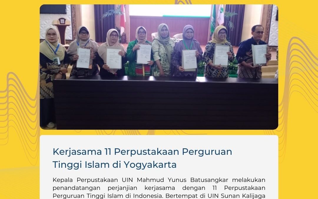 berikut ini 11 perpustakaan perguruan tinggi islam yang melakukan perjanjian kerjasama dengan Perpustakaan UIN Mahmud Yunus Batusangkar di UIN Sunan Kalijaga Yogyakarta pada hari ini 25 Juli 2024: